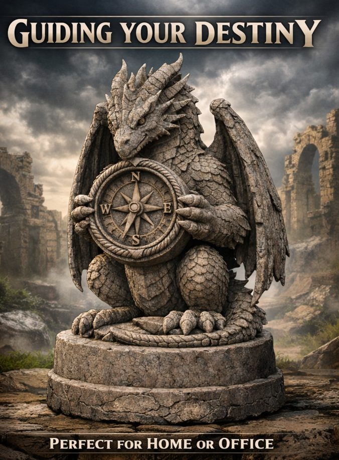Commanding and intricately sculpted, the Dragon Guardian Compass Statue captures the timeless symbolism of strength, wisdom, and direction. This striking piece features a meticulously detailed dragon perched in a protective stance, its powerful wings partially unfurled and its talons firmly grasping a classic compass rose marked with the cardinal directions.