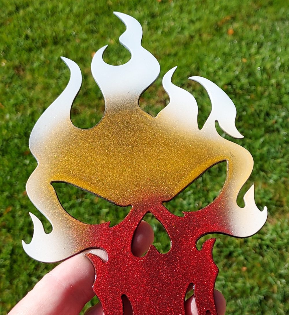 Custom painted small Fire Skull is 7″ H x 4.25″W and is cut from 16 gauge sheet metal. Backside is bare metal. MADE IN FALLON, NEVADA