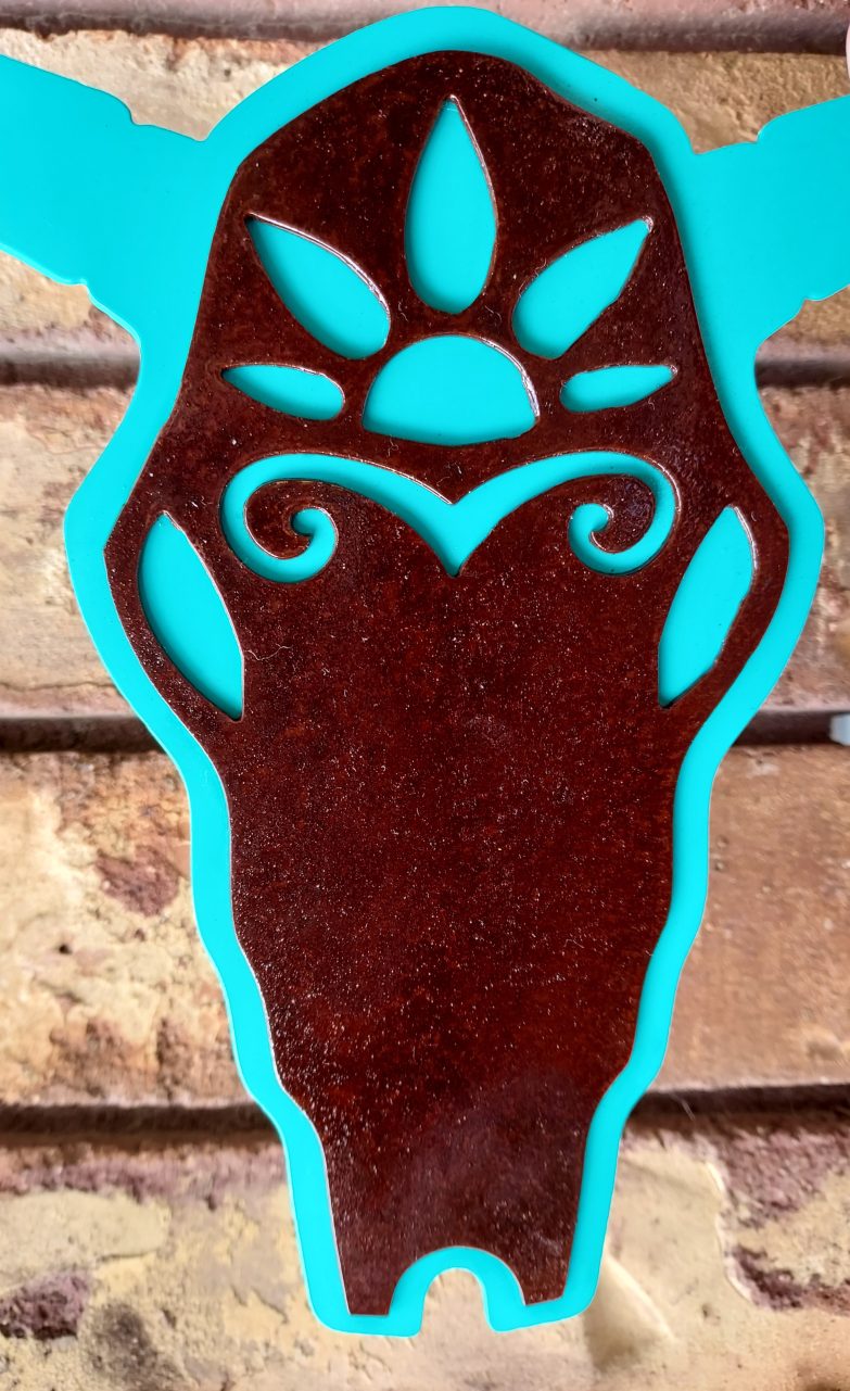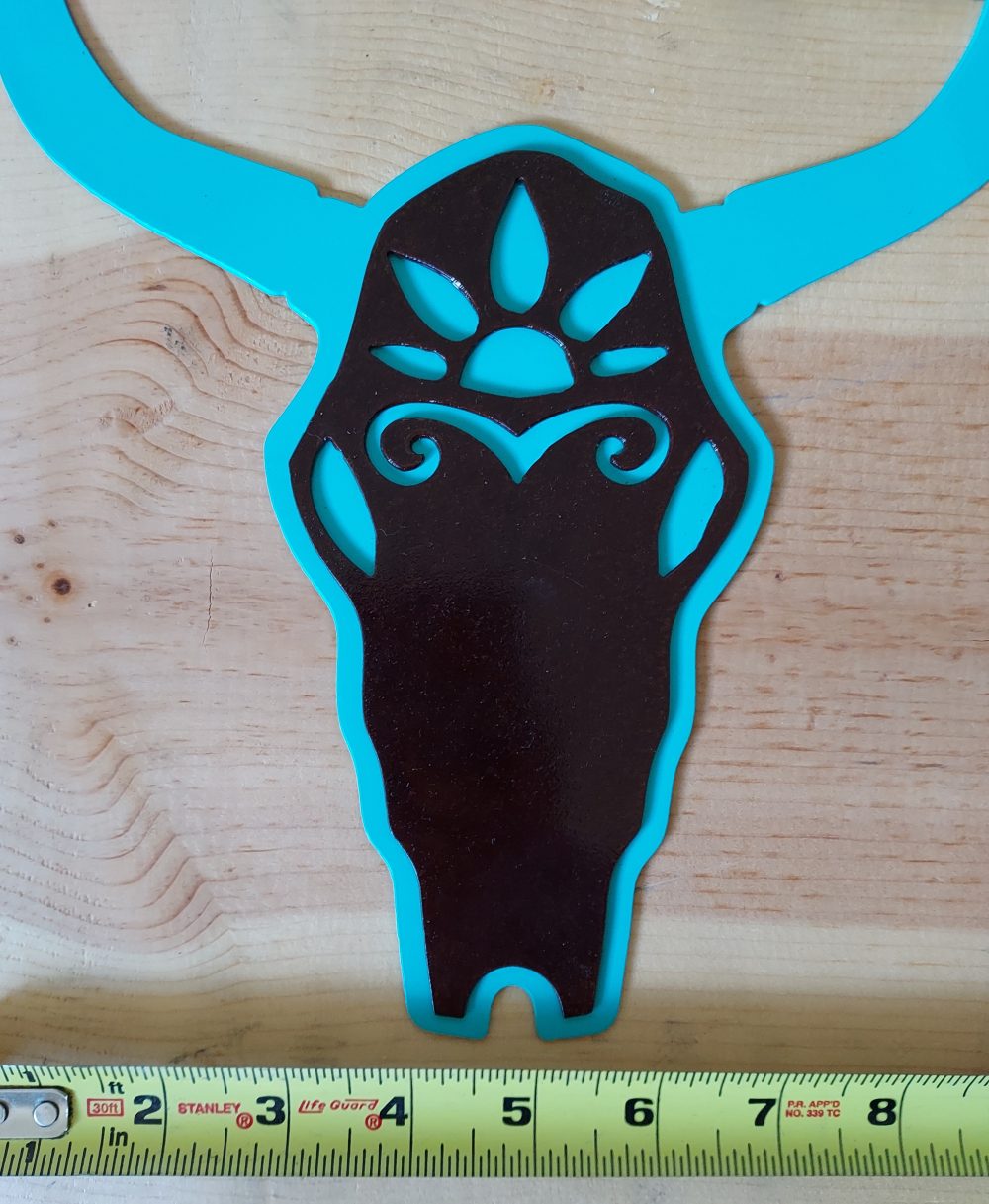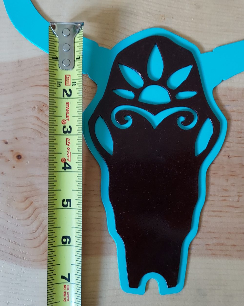This 2 piece metal Longhorn is a perfect gift for your favorite cowgirl or cowboy. The face and back piece are each cut from 16 gauge sheet metal. The face has a sealed rustic finish which is attached to the blue back. Dimensions- 9.50″W (from tip to tip of the horns) x 11″ H (from tip of horns to bottom of face/head). Please look at pics for detailed measurements. Made in Fallon, Nevada