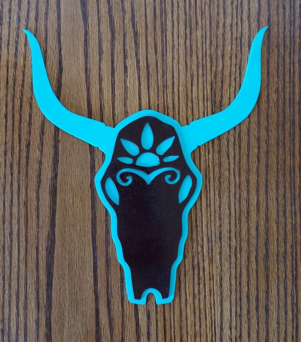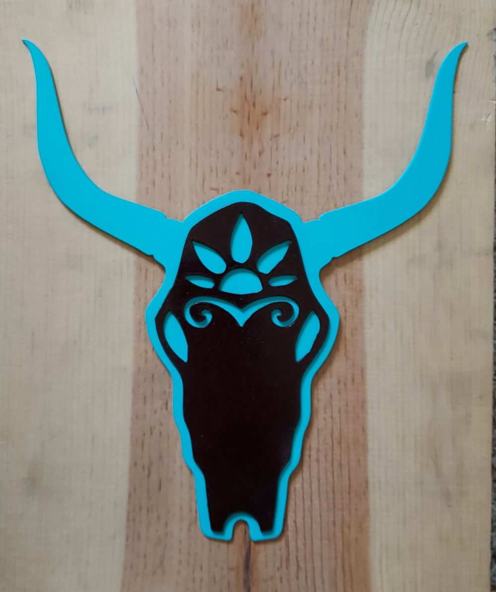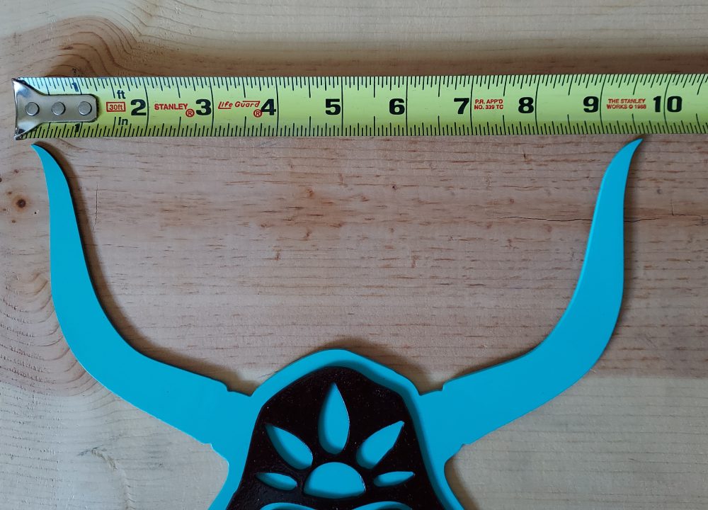 This 2 piece metal Longhorn is a perfect gift for your favorite cowgirl or cowboy. The face and back piece are each cut from 16 gauge sheet metal. The face has a sealed rustic finish which is attached to the blue back. Dimensions- 9.50″W (from tip to tip of the horns) x 11″ H (from tip of horns to bottom of face/head). Please look at pics for detailed measurements. Made in Fallon, Nevada
