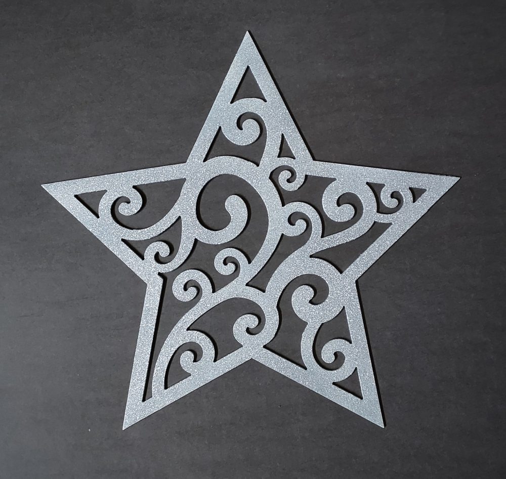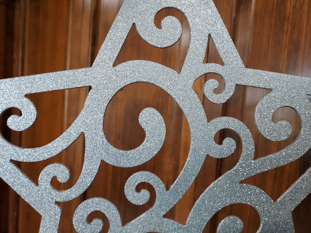 This metal Star with swirls adds a festive accent for birthdays, holidays or special occasions. It is painted on both front and back with silver glitter spray paint, which makes it perfect to hang where both sides are visible. It is cut out of 16 gauge sheet metal. Dimensions: 12″W x 12″H MADE IN FALLON, NEVADA