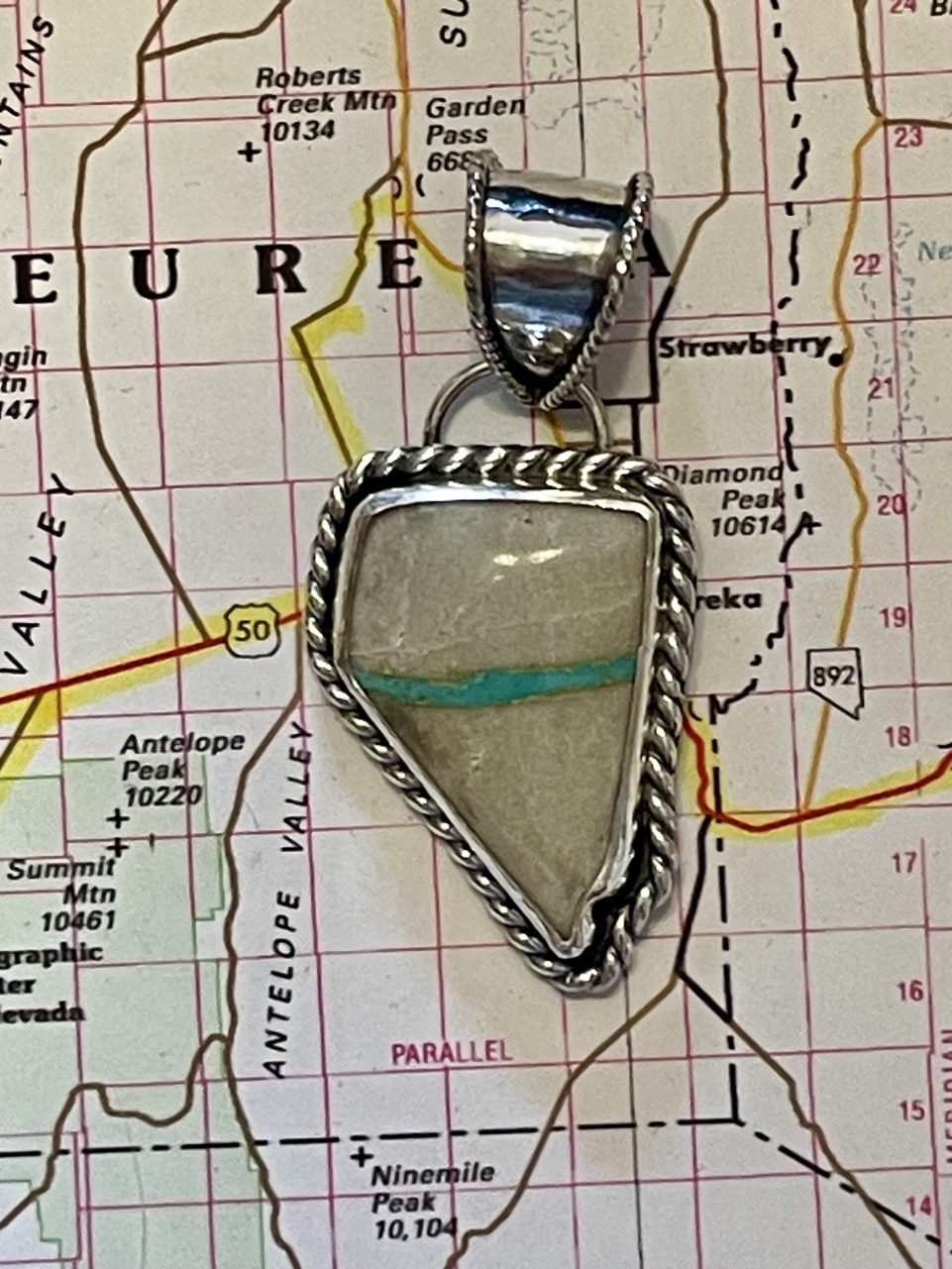 This pendant has gorgeous bright blue vein of turquoise in a creamy tan host rock, set in sterling silver. Includes a stainless steel chain.