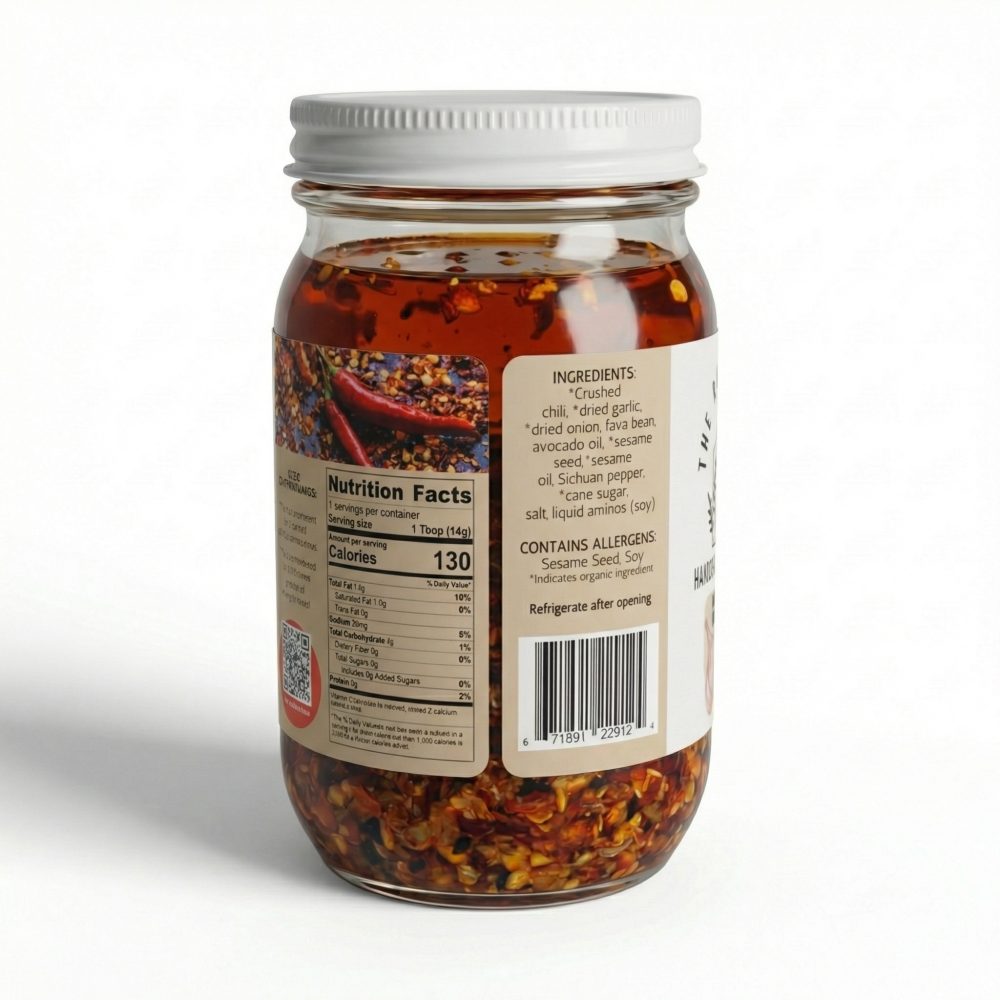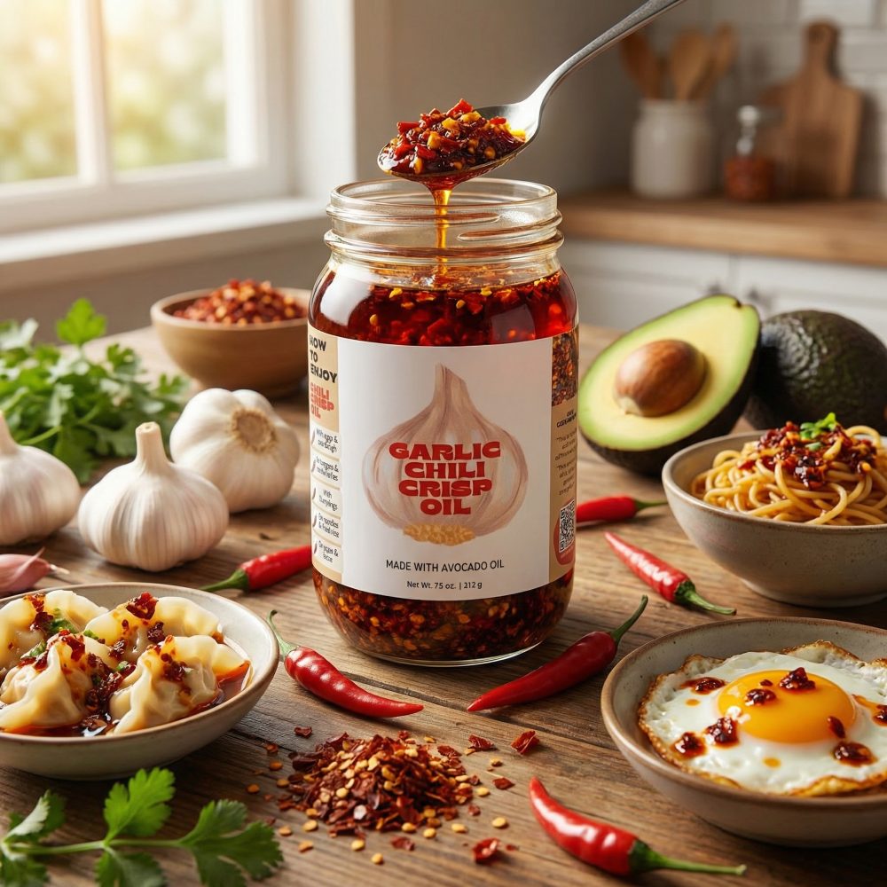 Garlic Chili Crisp Oil: A bold, savory garlic chili crisp packed with irresistible crunch and layered heat. This flavorful blend features organic garlic and onion, crispy fava beans, organic sesame seeds, Szechuan peppercorns, and organic crushed red chilis, all simmered in organic avocado oil. Spoon it over noodles, eggs, pizza, rice, vegetables, or grilled meats for a rich, garlicky kick and perfectly crisp texture in every bite.