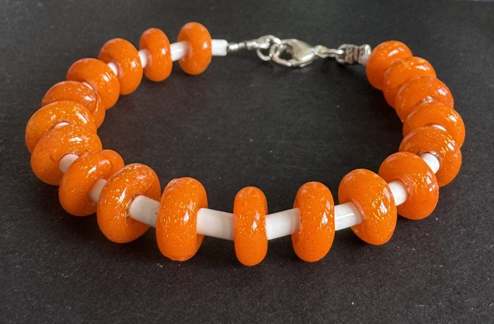 Orange donut shaped artisan glass beaded bracelet with white enamel tube spacers. Sterling silver lobster clasp. This beautiful, unique bracelet, is sure to please the most discerning eye. Fits up to a 7 inch wrist.