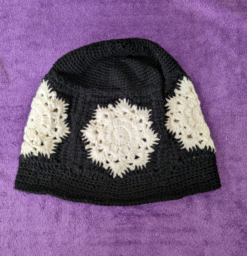 This exquisite, hand-crocheted accessory boasts an intricate granny square design with a captivating snowflake motif, creating a visual feast for the eyes. The off-white snowflakes pop against the black.
