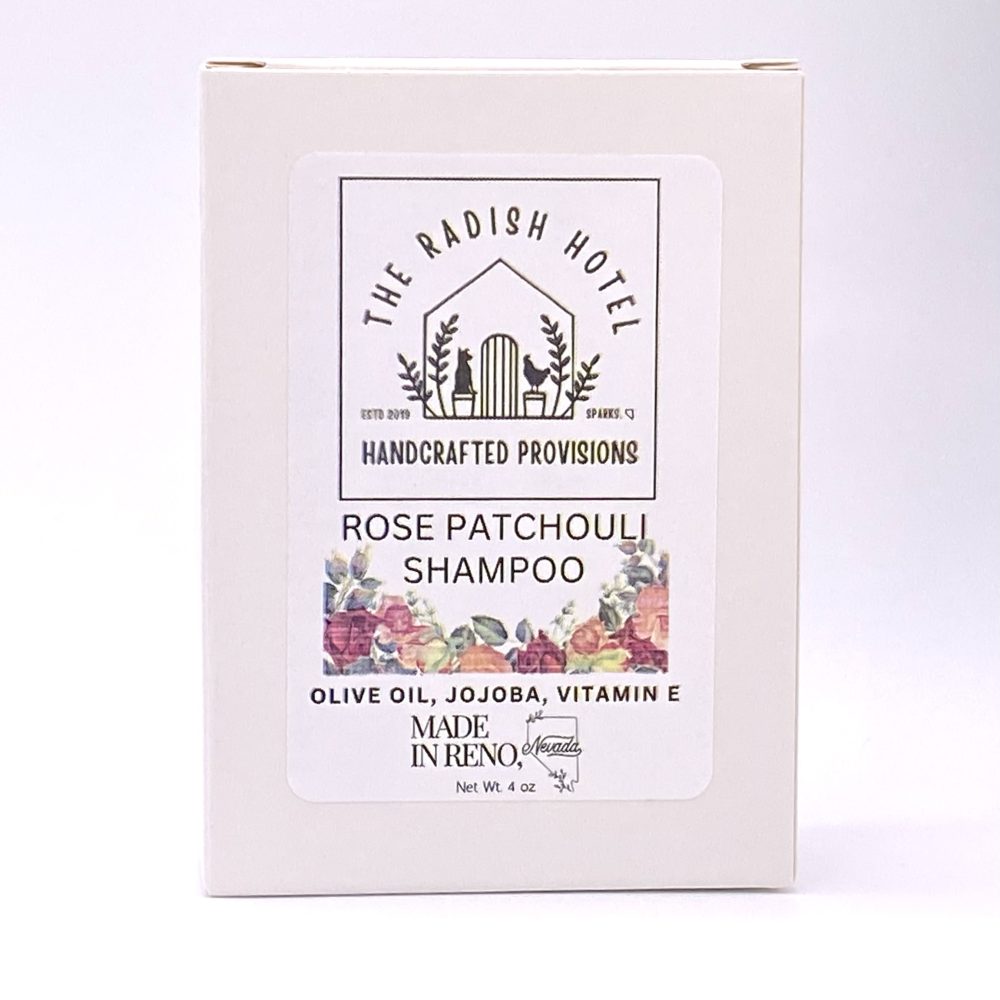Shampoo Bar Ingredients: Olive Oil, Coconut Oil, Castor Oil, Sweet Almond Oil, Jojoba Oil, Coconut Milk, Vitamin E, Rosemary or Lavender or Rose + Patchouli Essential Oil, Lye