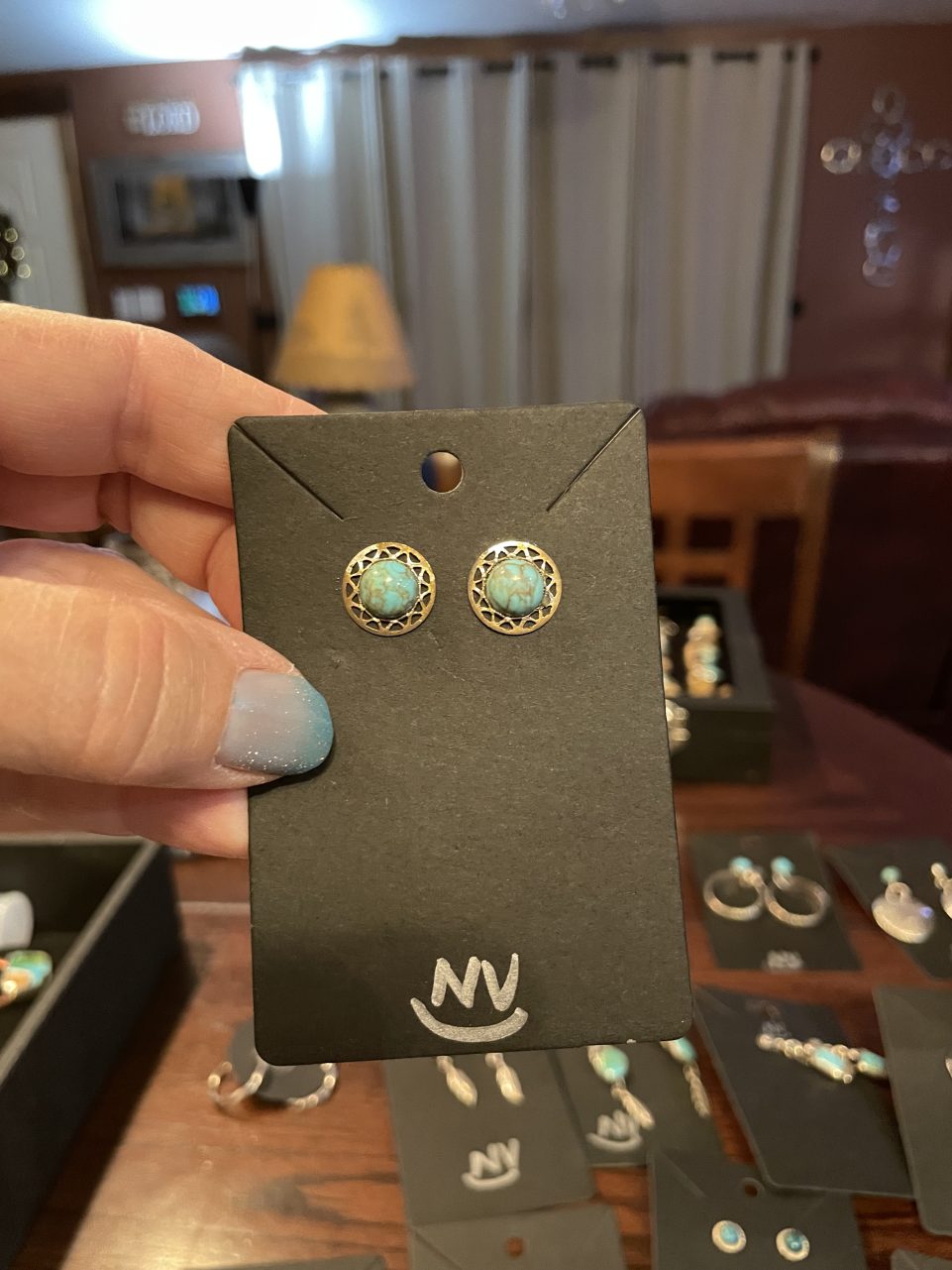 These earring feature an 8mm Kingman AZ turquoise stone set on 13.3mm decorative sterling silvers backs with sterling silver posts.
