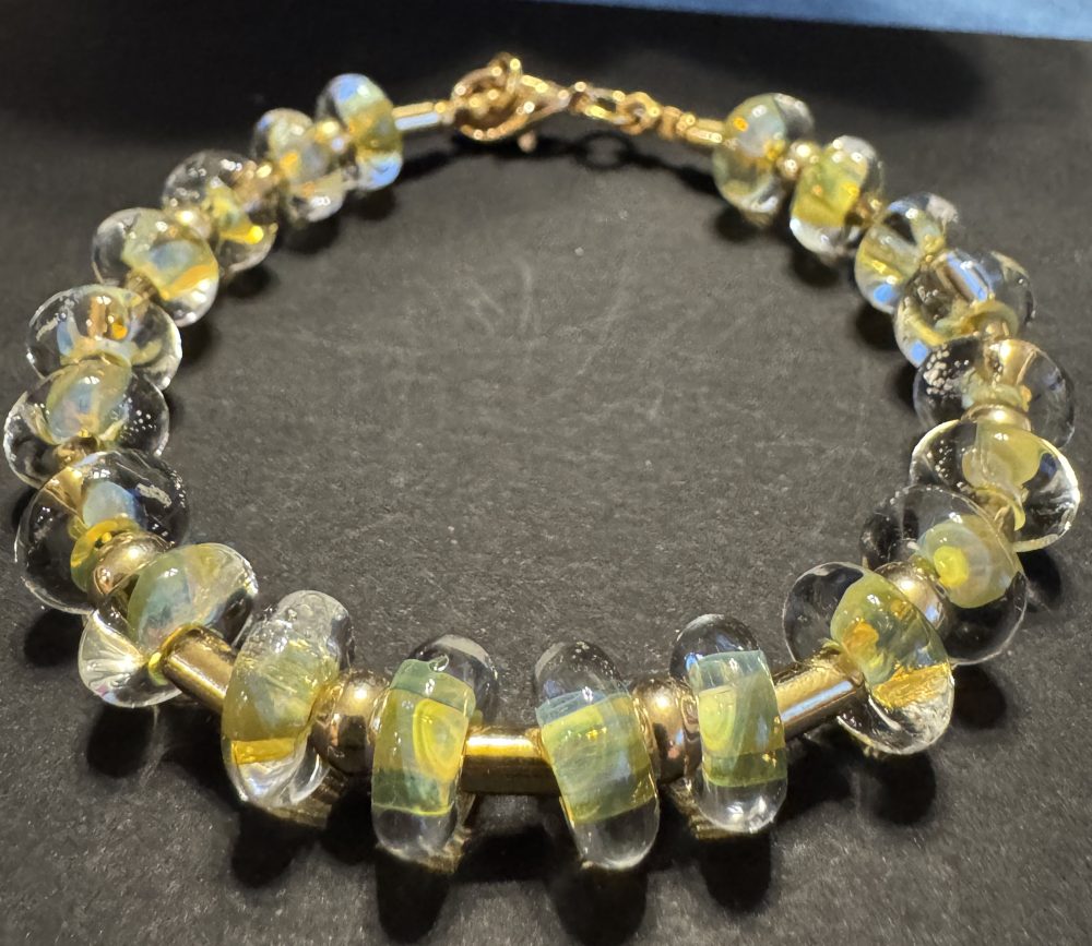 Yellow Donut shaped artisan glass beaded bracelet with gold enamel tube beaded spacers and gold filled beads. Gold filled Lobster clasp. This beautiful, unique bracelet, is sure to please the most discerning eye. Fits up to 7 inch wrist.